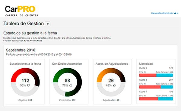 CarPRO es un tablero de comando que le permite monitorear toda la evolución de su cartera de clientes a lo largo de la vida del contrato, con información actualizada en tiempo real, de forma online